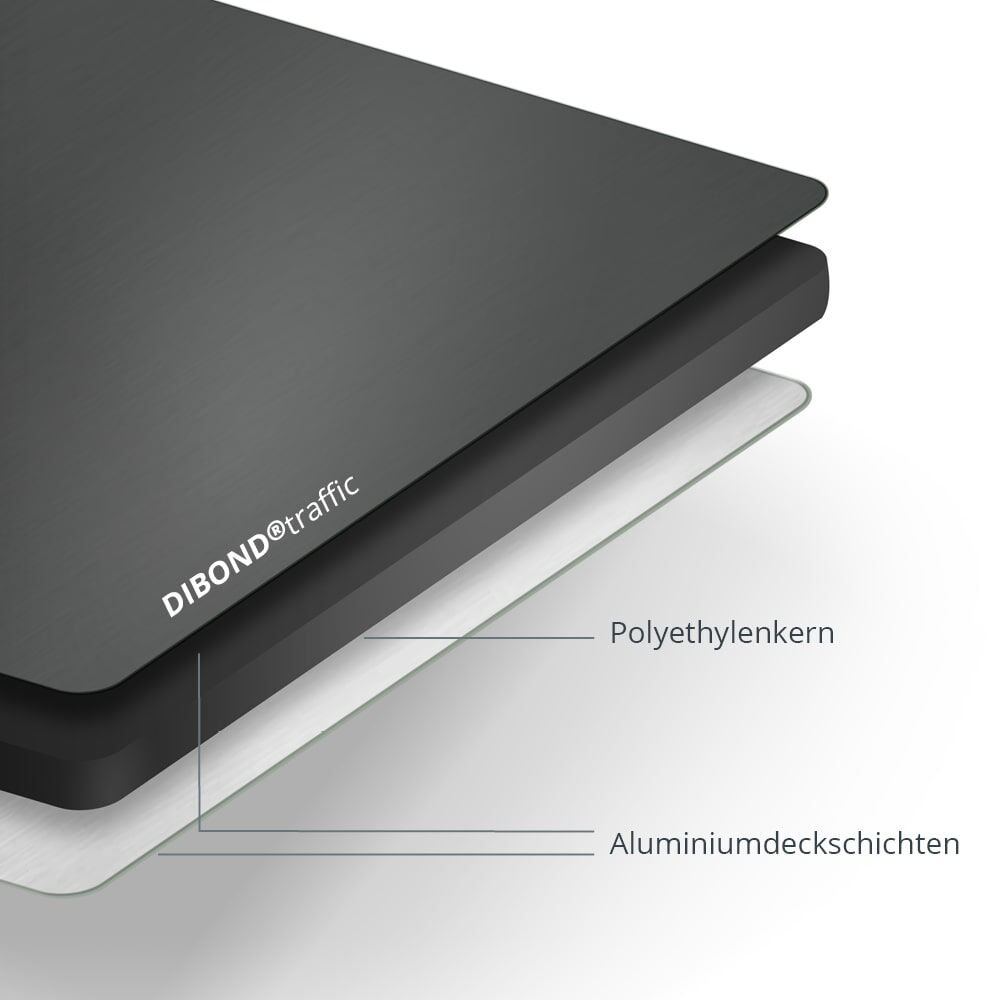 DIBOND®traffic ist eine qualitätiv hochwertige Alumiuniumverbundplatte, die aus zwei 0,3 - 0,5 mm mm dicken Aluminium-Deckschichten sowie einem Kunstoff-Kern aus Polyethylen besteht. Die Aluminiumdeckbleche sind mit der einzigartigen Legierung AIMg1 beschichtet.