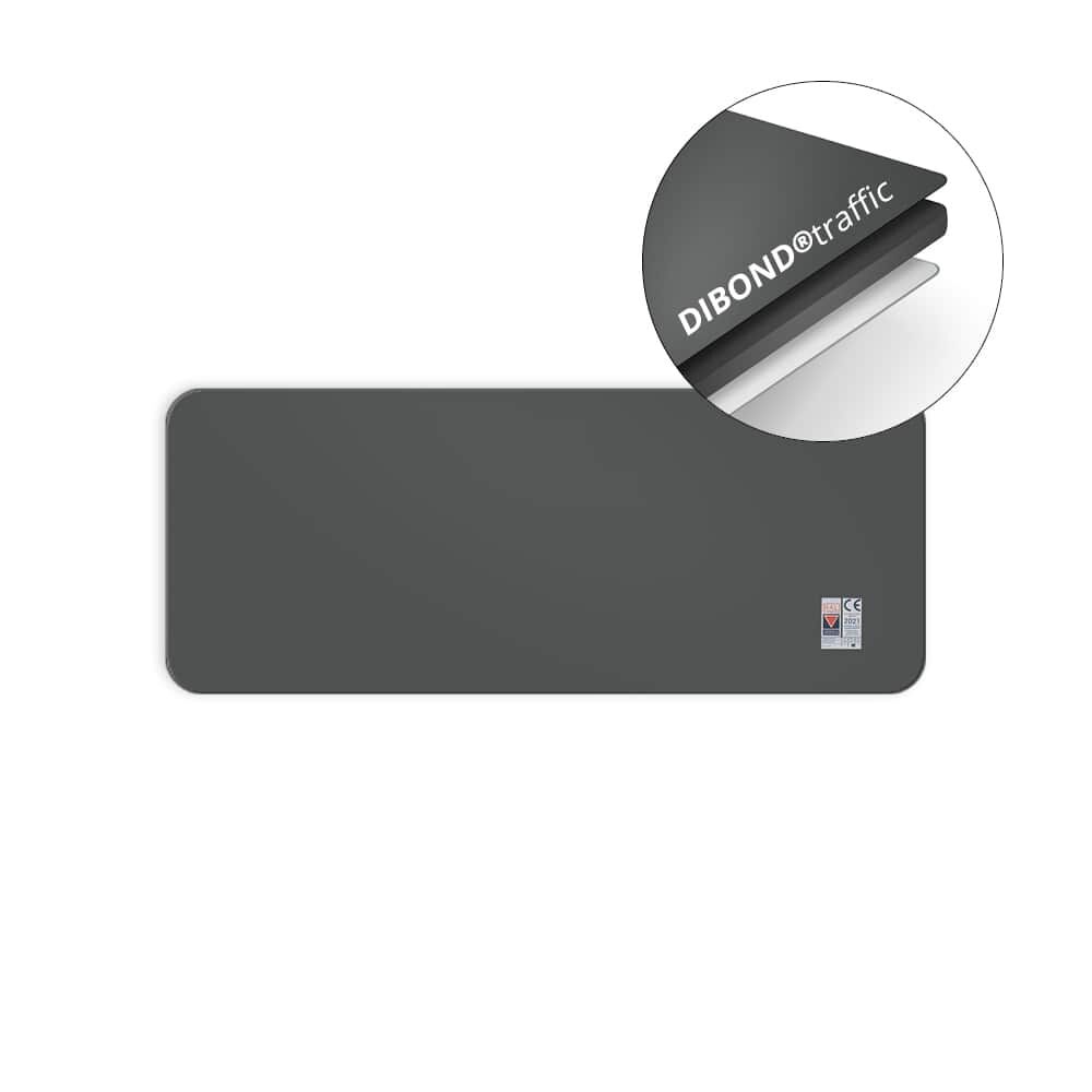 Die Materialstärke von DIBONDtraffic kann bedingt durch den Herstellungsprozess variieren. Der Toleranzbereich liegt zwischen 2 mm bis 2,2 mm (Alform) und 3 mm bis 3,2 mm (Flachform).