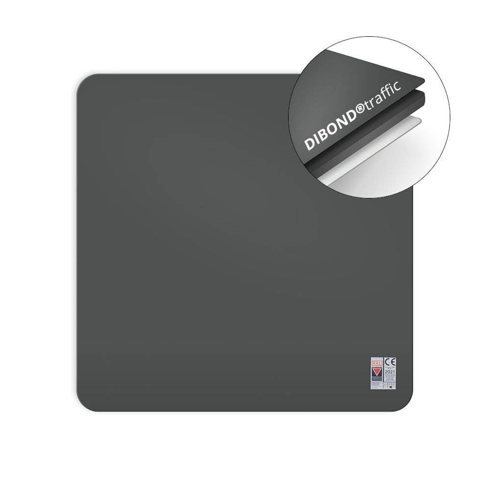 Die Materialstärke von DIBONDtraffic kann bedingt durch den Herstellungsprozess variieren. Der Toleranzbereich liegt zwischen 2 mm bis 2,2 mm (Alform) und 3 mm bis 3,2 mm (Flachform).