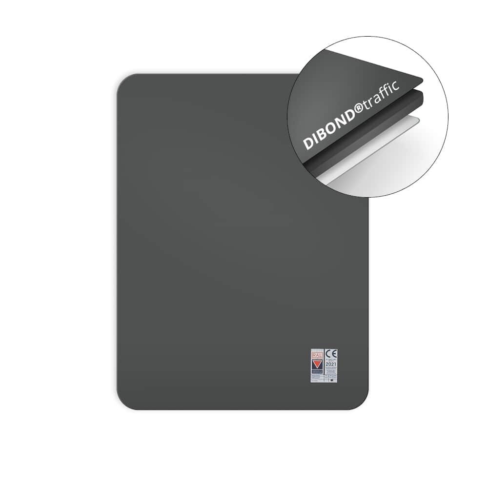 Die Materialstärke von DIBONDtraffic kann bedingt durch den Herstellungsprozess variieren. Der Toleranzbereich liegt zwischen 2 mm bis 2,2 mm (Alform) und 3 mm bis 3,2 mm (Flachform).