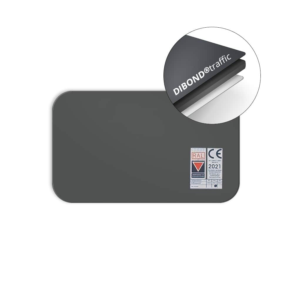 Die Materialstärke von DIBONDtraffic kann bedingt durch den Herstellungsprozess variieren. Der Toleranzbereich liegt zwischen 2 mm bis 2,2 mm (Alform) und 3 mm bis 3,2 mm (Flachform).