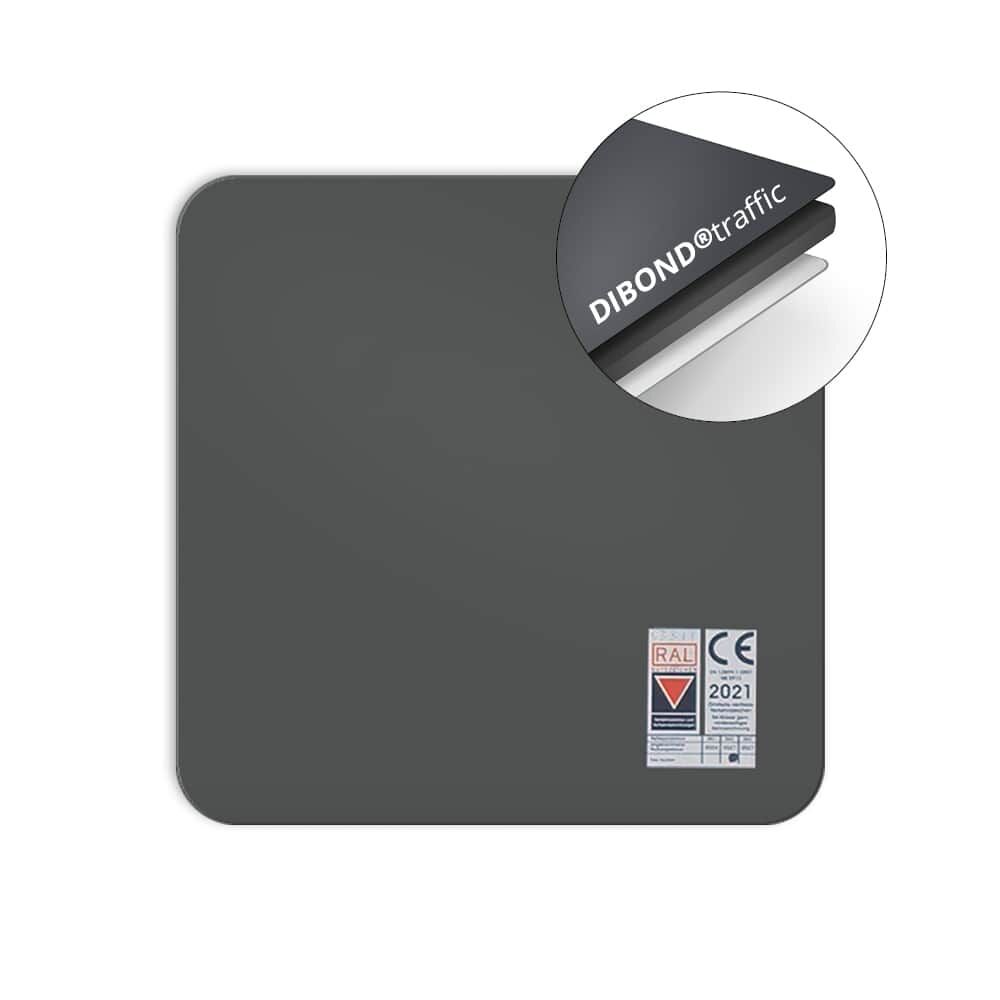 Die Materialstärke von DIBONDtraffic kann bedingt durch den Herstellungsprozess variieren. Der Toleranzbereich liegt zwischen 2 mm bis 2,2 mm (Alform) und 3 mm bis 3,2 mm (Flachform).