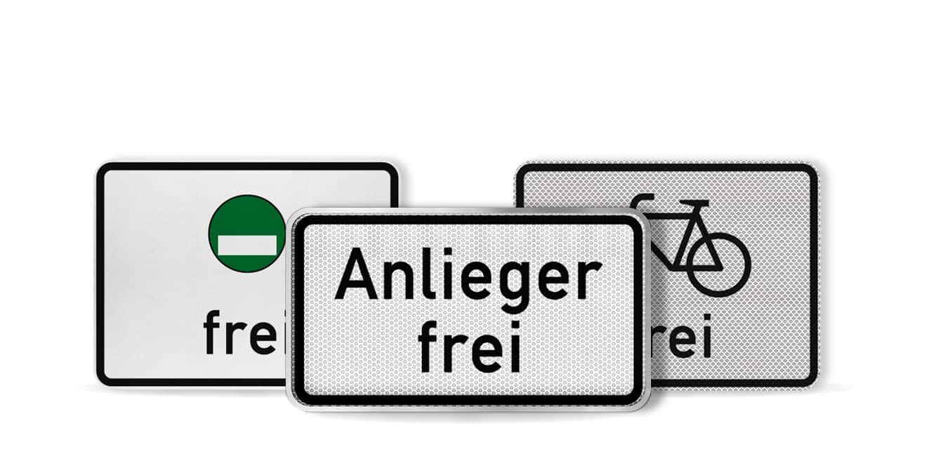 Material: DIBOND®traffic Maße: 231 x 420 mm, 330 x 600 mm, 412 x 750 mm Reflexionsklasse: RA1, RA2, RA3 Bauart: Flachform (3 mm), Alform Schildform: RechteckVerkehrszeichen-Nr.: 1012-30 (Zusatzzeichen nach § 39 Abs. 3 StVO) Lieferumfang: ohne Befestigungsmaterial Die Materialstärke von DIBONDtraffic kann bedingt durch den Herstellungsprozess variieren. Der Toleranzbereich liegt zwischen 2 mm bis 2,2 mm (Alform) und 3 mm bis 3,2 mm (Flachform).Produkteigenschaften Verkehrszeichen 1012-30 Anlieger freiStandardverkehrszeichen gemäß StVOLieferung mit CE- und RAL-GütezeichenZertifizierte Gleichwertigkeit zu Vollaluminium durch das BMDV.Das Aluverbund-Material DIBOND®traffic hat gegenüber Vollaluminium als Bildträgermaterial vorteilhafte Eigenschaften:Das Material ist leichtgewichtiger und überzeugt durch seine sehr hohe Biegefestigkeit, außerdem ist es zu 100 % recyclebar.Die Schilder in Flachform sind bombiert gefräst, d. h. der Rand ist abgerundet (nicht scharfkantig) zur Minimierung der Verletzungsgefahr.Übersicht zur Auswahl der SchildgrößeDie Auswahl der Größe des Verkehrszeichens ist abhängig von der zulässigen Höchstgeschwindigkeit am Aufstellort: Größe des Zusatzschildes (Höhe 1) 231 x 420 mm Größe 1 = 70% 330 x 600 mm Größe 2 = 100% 412 x 750 mm Größe 3 = 140% Geschwindigkeit 20 - 49 km/h 50 - 100 km/h über 100 km/hÜbersicht zur Auswahl der ReflexionsklasseDas „Merkblatt für die Wahl der lichttechnischen Leistungsklasse von vertikalen Verkehrszeichen und Verkehrseinrichtungen“ (MLV) gibt Aufschluss über die richtige Auswahl der Leistungsklasse der Verkehrszeichenfolien: Welche Reflexionsklasse ist für welchen Aufstellungsort geeignet.Die Verkehrszeichen sollen bei Dunkelheit unter allen Umfeldbedingungen gut erkennbar sein.In der DIN 67520 sind drei Reflexionsklassen für Verkehrszeichen mit verschiedenen Mindestrückstrahlwerten festgelegt, welche für die unterschiedlichen Aufstellorte geeignet sind. Reflexionsklasse RA1 RA2 RA3 Aufstellort, geeignet für:SonderwegeBetriebsgeländeHalteverbotetouristische Unterrichtungstafeln gemäß Zeichen 386 StVO und VwV-StVO zu Zeichen 386städtische Bereiche mit geringer Umgebungshelligkeitverkehrsberuhigte Zonen und Orte mit geringer VerkehrsdichteBundesstraßenLandstraßenstädtische Bereichemittlere Umgebungs-helligkeitOrte mit mittlerem VerkehrsvolumenAutobahnOrte mit hohem VerkehrsaufkommenÜberkopfschilderBeschilderung auf der linken Fahrbahnseitehelle Umgebung mit vielen Lichtquellen (innerstädtisch z. B.)