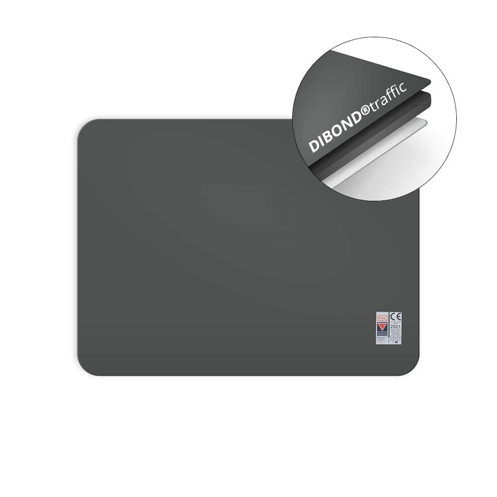 Die Materialstärke von DIBONDtraffic kann bedingt durch den Herstellungsprozess variieren. Der Toleranzbereich liegt zwischen 2 mm bis 2,2 mm (Alform) und 3 mm bis 3,2 mm (Flachform).